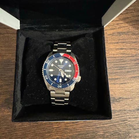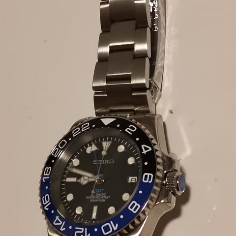 Nydelig Seiko til salgs. Klokka er lite brukt og i veldig god stand. Det er maksimalt enkelte hairlines. Noen mindre merker på låsen. Glasset er strøken. Kommer med komplett lenke og den originale esken.
