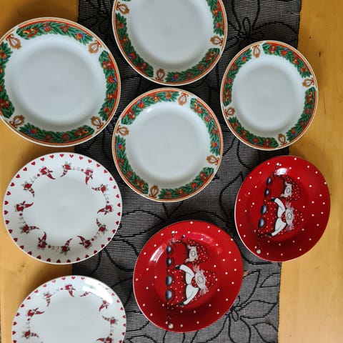 Mikke som pynter tre og Donald som fotograf, både middagstallerkener og frokostfat. Selges samlet