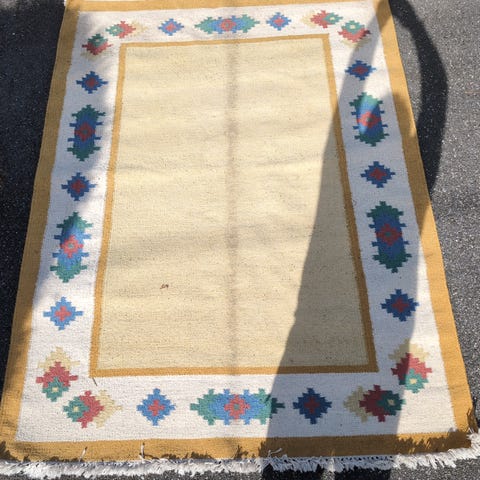 Teppe med rutemønster i lys og mørk grå. myk, høy lugg og vevd diamant-/rutemønster i kontrastfarge. Kjøpt på Jysk i sin tid. Rektangulær form, egnet til bruk i stue, spisestue eller andre oppholdsrom. Fungerer som gulvteppe for å skape en mykere og mer dempet overflate på harde gulv. Får en fin marokkansk vibe av teppet da mønsteret er lik mange type Beni Ourain tepper. Teppet skaper varme og lunhet. Det er godt brukt over flere år og hadde nok trengt en vask eller spyling av noe slag, den jobben orket ikke vi å ta på oss.