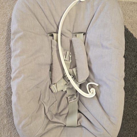 Stokke Tripp Trapp Newborn Set babysete i grå tekstil. Setet festes på Tripp Trapp-stolen og er beregnet for nyfødte. Det har polstret trekk og integrert sele med justerbare stropper for å holde barnet på plass. Baksiden er i hard plast med ventilasjonshull og festeanordninger til stolen. Egnet for bruk fra nyfødt og opp til vekt- og aldersgrensen som er angitt av produsenten.
