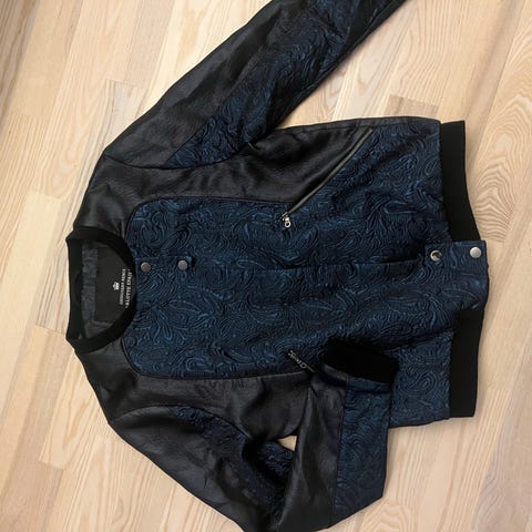 Designers Remix jakke for dame i størrelse M (merket 38). Jakken har blått mønstret stoff kombinert med svarte partier, med glidelåslommer i front og ribbekant nederst og ved ermene. Rund hals og knappelukking øverst foran, samt glidelåsdetaljer. Passer som lett ytterjakke eller som et lag over andre plagg, eller som en blazer.