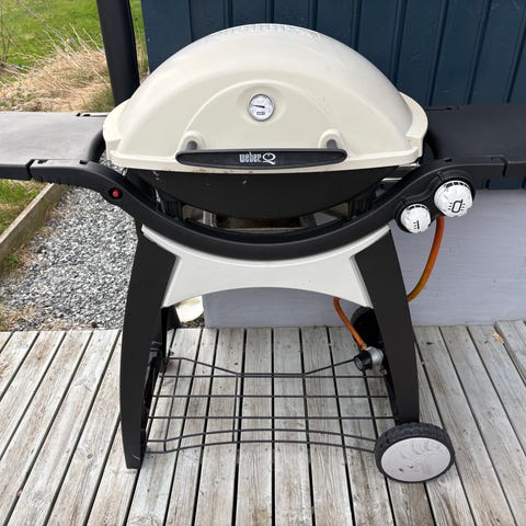 Gassflaske følger ikke med og grillen trenger en skikkelig vask.