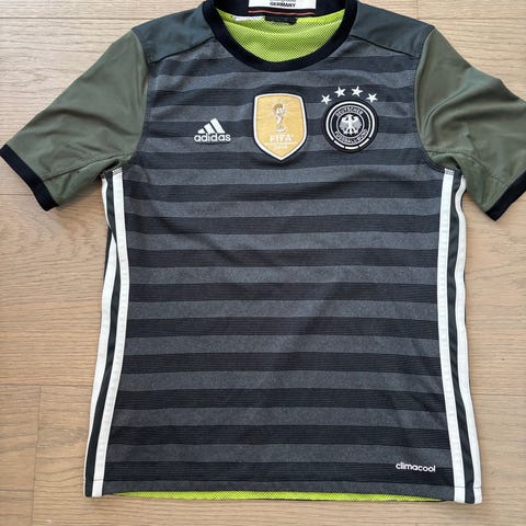 Adidas Real Madrid fotballdrakt i svart med gule detaljer. Drakten har klubbmerke og sponsorlogo på brystet, samt navn og nummer Bellingham 5 på ryggen. Pent brukt før den ble for liten 13-14 år