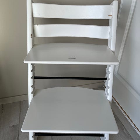 Hvit Stokke Tripp trapp-stol med forlengere. Brukt av to barn så det er synlige bruksmerker, men ikke veldig skjemmende. Veldig mye bruk igjen.