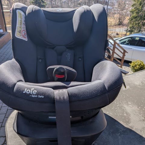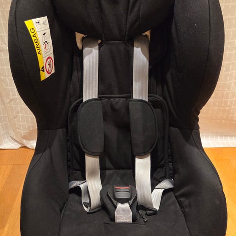 Setet har justerbar internsele med polstrede skulderstropper og hodestøtte, samt sidekollisjonsbeskyttelse. Trekket er i svart tekstil og kan tas av for rengjøring.