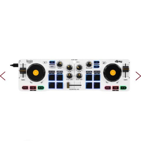 Numark DJ-kontroller med to joghjul, mikserseksjon og innebygde kontroller for avspilling, cue, looping og effekter. Enheten har flere knotter og fadere for justering av volum, EQ og miksing mellom to kanaler. Kontrolleren kobles til via USB-kabel og er egnet for bruk sammen med DJ-programvare på PC eller Mac. Passer til digital miksing av musikk hjemme eller på mindre arrangementer.