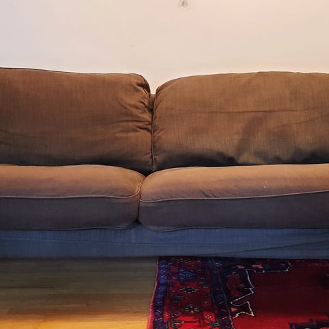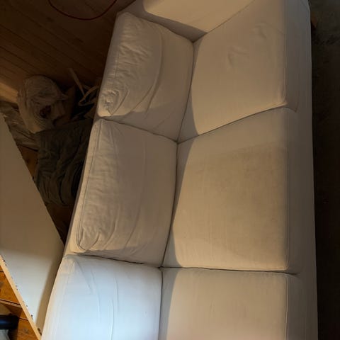 sofaen er godt brukt. Det ene armlenet er slitt og det er noe misfarging på stoffet. Trekkene er avtagbare og kan vaskes. Må hentes