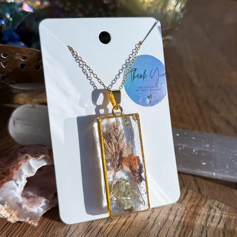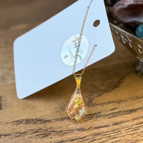 Håndlaget halskjede med rombeformet anheng i gyllen ramme, dekorert med blomsterdetaljer, gullfolie, shimmer, fiskefigurer og ulike elementer inni. Et glitrende smykke med en fin fargekombinasjon. Lenken er laget av gullfarget rustfritt stål.