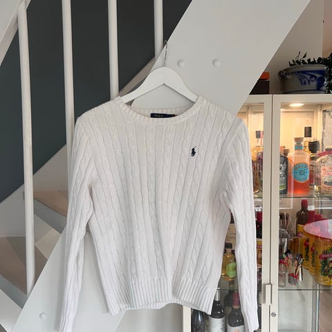 Polo Ralph Lauren genser for dame i størrelse M. Genseren er beige og strikket i bomull med flettestruktur. Rund hals og lange ermer. Passer til hverdagsbruk og kan kombineres med både bukser og skjørt.