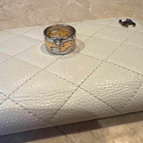 Nr 2: sølvring med svart emalje eller en type stein(?). Str 53. Også kjøpt i Puerto Banus av foreldrene mine, sannsynligvis ett eller to år etter at første ringen ble kjøpt. Også ligget i mange år og oksidert. Trenger puss/ polering og kan se veldig flott ut igjen, men ordinære bruksmerker som hairlines må påregnes ved kjøp. Også kjøpt en eller annen gang før 2015. Mulig jeg kan finne kvittering, men ingen garanti. 1800kr eller bud.