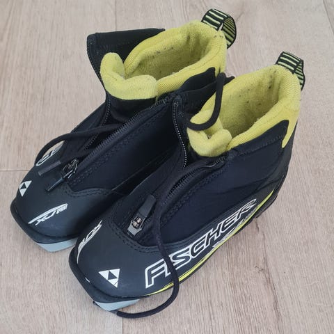 Gode Fischer langrennsko i str 33. Svart/sølv/gul farge. Glidelås i front for lukking og beskyttelse mot snø.