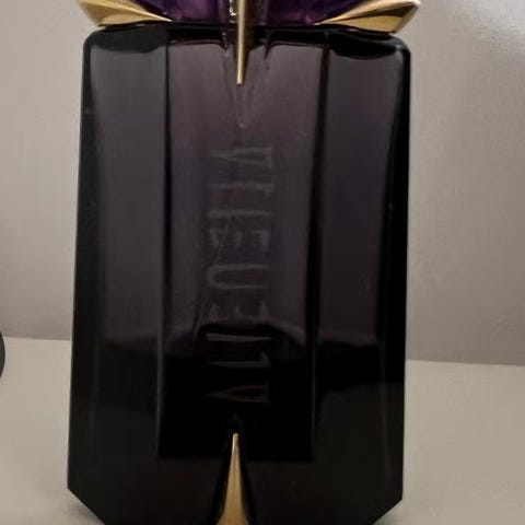 Selger en Mugler Alien Eau de Parfum. Denne parfymen er kjent for sin distinkte flaske inspirert av ametyst, og duften inneholder noter av jasmin sambac, kasjmirtre og hvit amber.