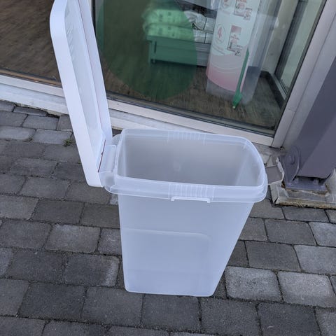Plastbeholder med lokk i hvit farge. Beholderen er rektangulær med hengslet lokk og låsemekanisme i front. Passer til oppbevaring av for eksempel tørrvarer, dyrefôr eller annet innhold som ønskes lukket og beskyttet. Laget av plast som er enkel å rengjøre. Beholderen er egnet til bruk på kjøkken, vaskerom eller bod.