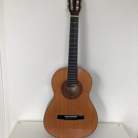 Ubrukt klassisk akustisk gitar med nylonstrenger selges rimelig. Kroppen har tradisjonell klassisk fasong, og gripebrettet har bånd i full lengde. Gitaren passer til fingerspill, akkordspill og generell øving på klassisk eller akustisk repertoar. Veldig fin gitar for deg som ville lære å spille.