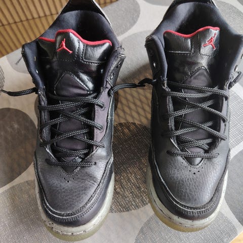 Svarte og røde sko i merket Nike Air Jordan i str. 36.5 selges for kr. 150. Noe slitasje (se bildet), men mye bruk igjen.