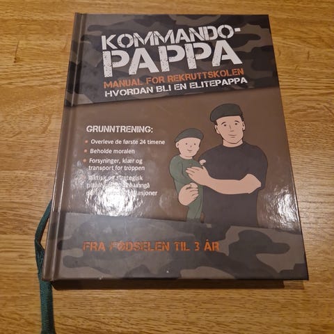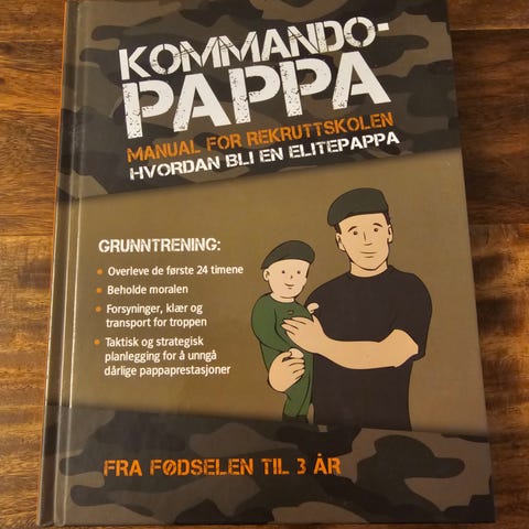 1) "Kommando-pappa". Boken har militært inspirert design og omhandler farsrollen fra fødsel til 3-årsalder, med praktiske tips og illustrasjoner.