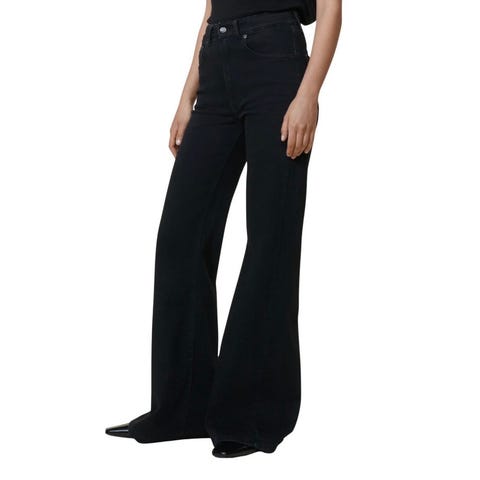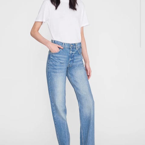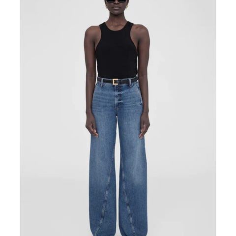 Råkule jeans fra Anine Bing. Str 29. Disse buksene er i en boyfriend inspirert modell, dvs en avslappet, rett modell ("relaxed-straight") med høyt liv. Fargen er mørk gråblå. Buksen er uten stretch, kul splitt nede på buksebena. Nesten ikke brukt.