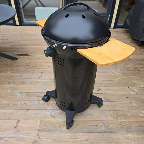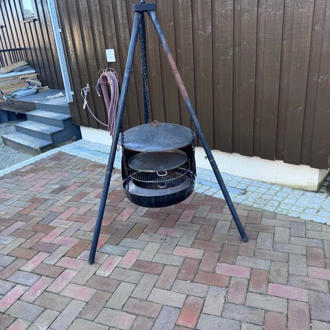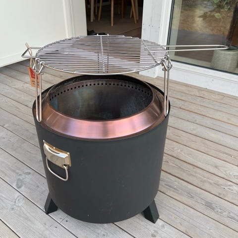 Sunwind bålpanne / utepeis med grillrist. Modellen har tre bein og rund ildskål med gnistfanger i perforert metall rundt kanten. Over bålpannen henger en justerbar grillrist i stål. Kjetting til kaffekjelen.Det følger med tilpasset beskyttelsestrekk i svart materiale som dekker hele bålpannen ved lagring.
