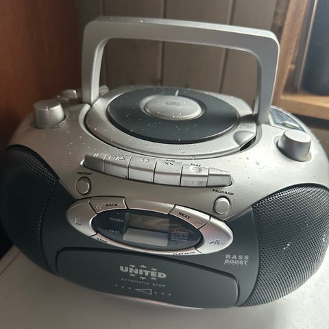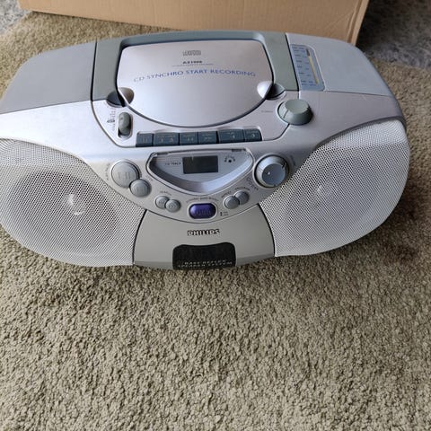 Sony CD-spiller i bærbart boombox-design i grå farge.