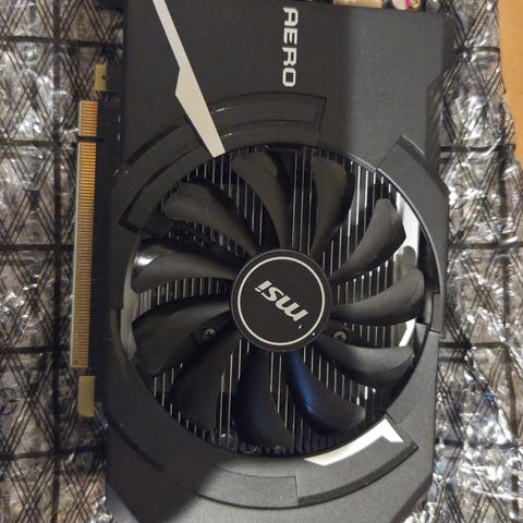Gigabyte skjermkort med to kjølevifter og PCIe-tilkobling. Kortet har flere videoutganger, inkludert DisplayPort, HDMI og DVI.