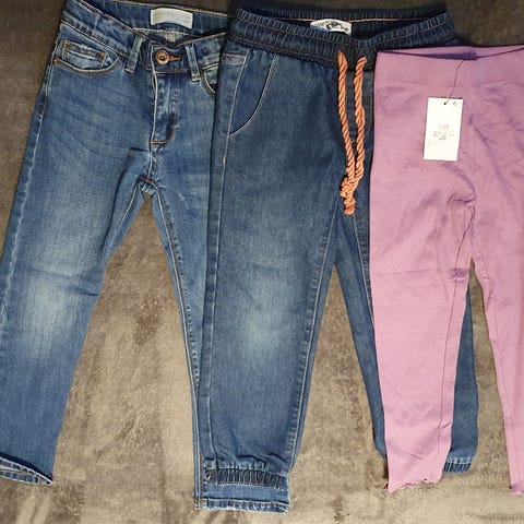 To bukser fra H&M i str 110. Pent brukt. Ingen hull. 2 glitter-tights. Den blå tightsen har nupper, men ingen flekker eller hull. Brukt av ett barn.