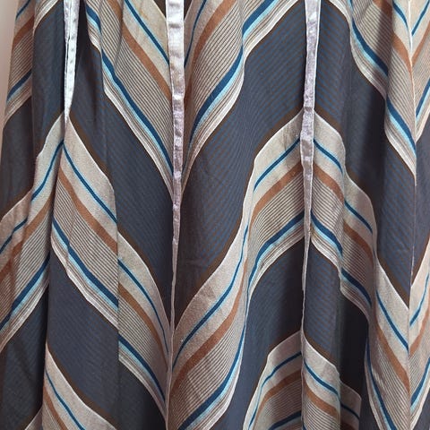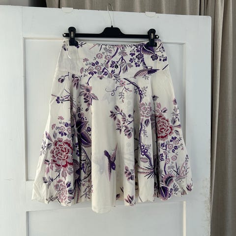 DAY Birger et Mikkelsen, mønstret, plissert skjørt i hovedsak lilla toner. Størrelse 38. Lengden er middels til lang, og fasongen er vid med folder som gir bevegelse i stoffet. Skjult glidelås i siden. Skjørtet kan brukes til både hverdags- og penere antrekk avhengig av styling og tilbehør.