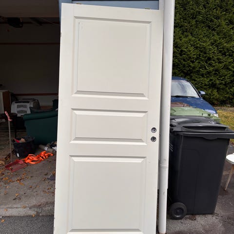 Selger som ny Pocket furu ( ubehandlet )skyvedør komplett. mål 82/210. Har også 2 hvitmalte furudører 200/82 for salg kr 350pr stk