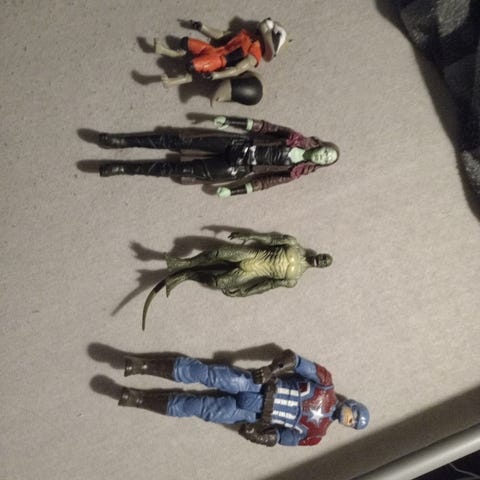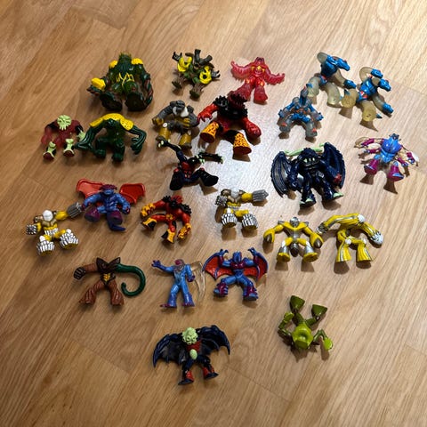 Actionfigurer små figurer i plast. Flere figurer i ulike farger, inkludert røde, oransje, grønne, lilla og svarte. Egner seg som leker, samleobjekter eller til utstilling. Størrelsen ser ut til å være små til mellomstore figurer som passer for barn eller samlere. Selges samlet som vist på bildet.