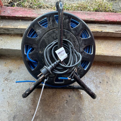 15m lang kabeltrommel og 3 skjøteledninger (rundt 15-25m pr stk).