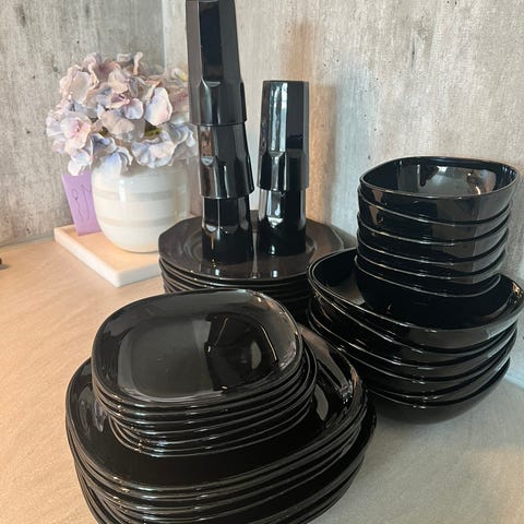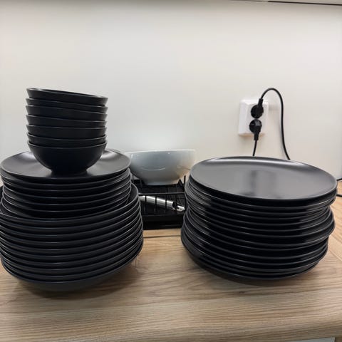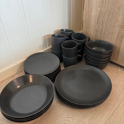 IKEA servise med tallerkener, skåler og kopper i ulike størrelser. Hovedsakelig svart servise med matchende kopper med blå innside, kombinert med hvite skåler og krus. Settet inneholder flate tallerkener, dype skåler og flere typer kopper/krus. Egnet til hverdagsbruk på kjøkkenet, til servering av varme og kalde retter, samt drikke som kaffe, te og andre varme drikker.