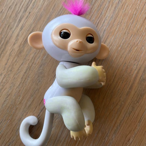 Morsom liten ape som blunker og lager lyder. Alt fungerer, batteri inkludert. Ny pris ca 400 kr. Se her: https://www.ringo.no/produkt/fingerlings-2-0-basic-monkey-purple-charli/