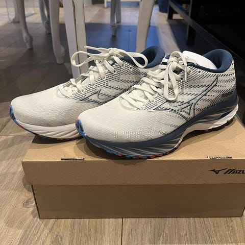 Mizuno løpesko i størrelse 38 (EU). Skoene er i svart farge med hvit mellomsåle og yttersåle med partier i lys brun. Overdelen er i pustende tekstilmateriale med snøring for justerbar passform. Modellen er egnet til løping og annen trening på hardt underlag