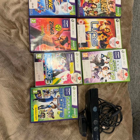 Xbox 360 spillpakke med flere titler, inkludert Kinect-baserte spill og actionspill. Spillene leveres på fysiske disker for Xbox 360-konsoll. Pakken inneholder ulike sjangre som eventyr, dans og action, egnet for bruk med standard Xbox 360-kontroller og enkelte titler for Kinect-sensor. Spillene kan brukes til lokal underholdning hjemme på kompatibel Xbox 360-konsoll. Kinect adventures og kinect avengers er uåpnet.