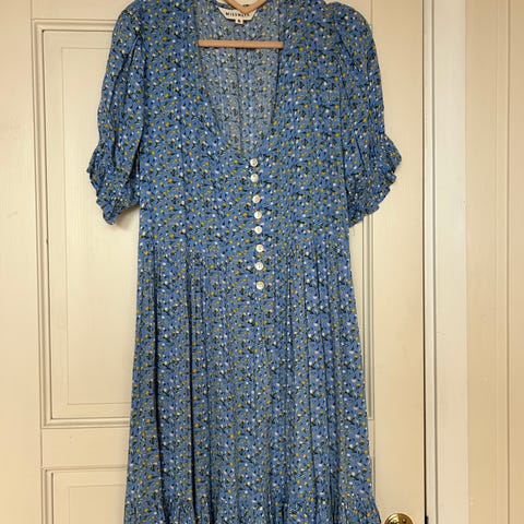 MISSMAYA sommerkjole for dame i størrelse L. Kjolen har hovedfarge blå med småblomstret mønster i hvitt, rosa og gult. Den har korte ermer og knapperekke foran. Stoffet er lett og faller mykt. Passer som sommerkjole til hverdag, eller fest. Se også mine øvrige annonser.