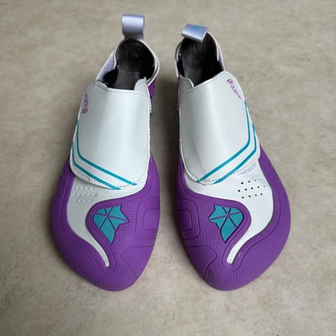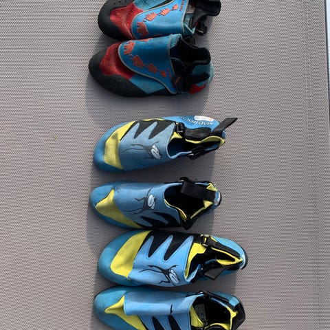 Mad Rock klatresko for barn i størrelse EU 33 (US 2 / UK 1,5). Skoene har myk overdel med borrelåslukking og gummisåle tilpasset innendørs og utendørs klatring. Fargekombinasjon i oransje, rød, hvit og svart. Som nye.