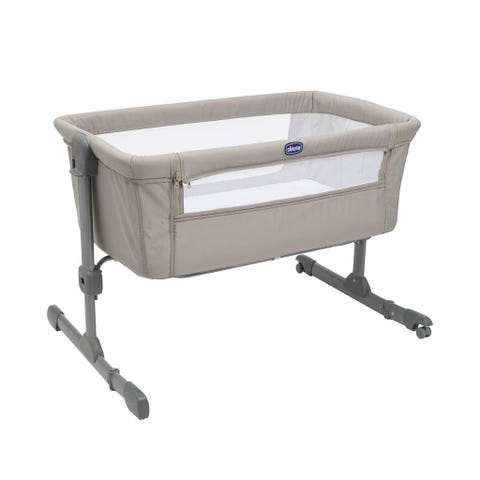 Chicco bedside crib i grått stoff. Sengen kan festes inntil voksenseng med medfølgende stropper, og høyden kan justeres etter sengens nivå.