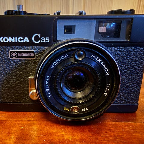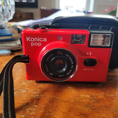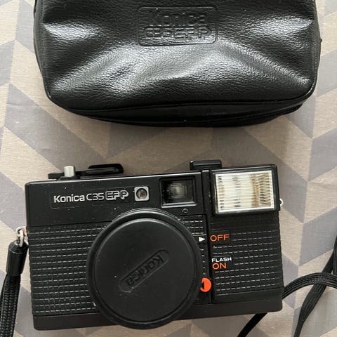 Konica Pop kompaktkamera i svart. Analogt 35 mm filmkamera med innebygd blits og fastmontert objektiv. Kameraet har enkel betjening med utløserknapp på toppen og filmfremtrekk på oversiden. Baksiden har søker og luke for filminnlegg, samt håndrem festet i siden for tryggere håndtering. Egner seg til generell fotografering med 35 mm film.