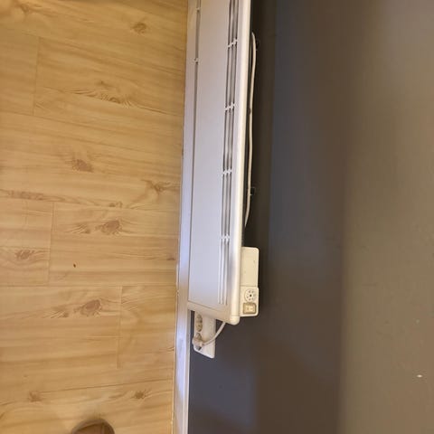 Mill panelovn i hvit utførelse. Veggmontert modell med avrundede kanter og front i glatt, hvit overflate. Ovnen har luftespalter på toppen for konveksjonsvarme og innebygd termostat/regulering på siden. Egner seg som fast oppvarmingskilde i oppholdsrom, soverom eller gang. Strømkabel med støpsel vises nederst langs veggen. Effekt og mål er ikke oppgitt og bør eventuelt måles eller kontrolleres av kjøper.
