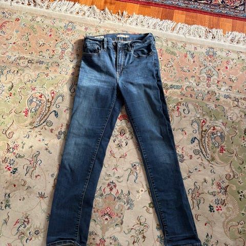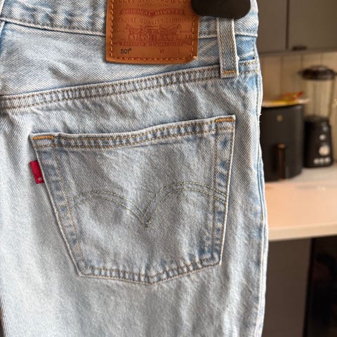 Levi's jeans for dame i størrelse M med livvidde W28. Buksen er i blå denim. Klassisk femlommers modell med baklommer og skinnpatch i linningen. Rå kant nederst på beina, som vist på bildene. Passer til hverdagsbruk og kan kombineres med ulike topper og sko.