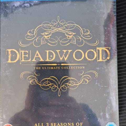 Deadwood The Movie DVD. Filmutgave av TV-serien Deadwood utgitt på DVD-format. Forsiden viser tittel og rollefigurer fra serien. Baksiden oppgir informasjon om språk, undertekster og aldersgrense, samt bonusmateriale. Disken inne i etuiet er merket «Wyatt Earp’s Revenge» DVD Video PAL. Produktet består av DVD-cover med omslag og én DVD-plate. Noen bruks riper men ikke dype. Selges 30kr +porto. Kan også sende uten fiks ferdig. Se også mine andere annonser.
