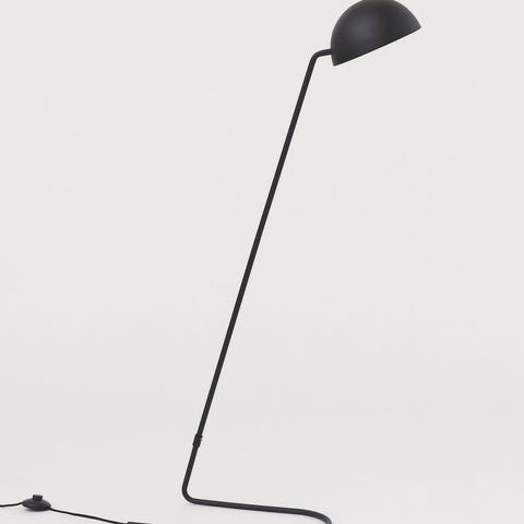 Elegant gulvlampe i matt sort stål på rektangulær fot med gulvbryter.