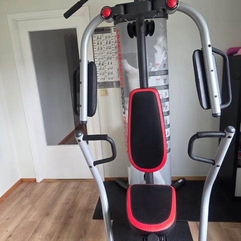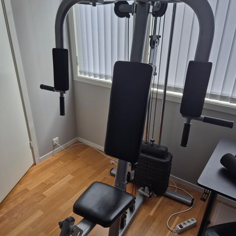 Multigym veggmontert treningsapparat.