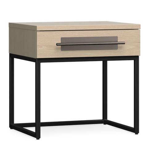 Et lekkert nattbord med 1 skuff i lakkert brunt Palisander-tre med ku-skinn i front av skuffen, ramme av matt sort jern.