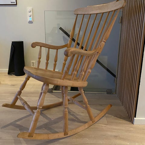 Flott håndlaget gyngestol i tre selges rimelig. Gyngestolen er pent brukt og selges med tilhørende krakk. Både stolen og krakken har påsydde puter.