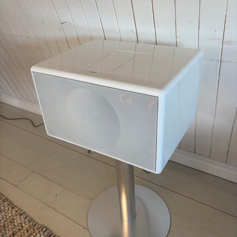 Mat inn en CD i slot-in CD-spilleren i Genevas pianolakkerte kabinett, eller bare sett på en spilleliste fra Spotify eller WiMP på nettbrettet ditt. Sett deg tilbake i godstolen og betjen hele systemet med den medfølgende fjernkontrollen. Geneva Sound System støtter alle kilder med mulighet for Bluetooth-avspilling, samt at du kan koble til andre musikkavspillere via linjeinngangen på baksiden. Geneva Sound System har også et display gjemt bak gitteret i front. Via dette får du informasjon om hvilken kilde som er tilkoblet, volum, spor på CD-en eller radiokanal. Geneva Sound System modell L og XL kan leveres med gulvstativ som ekstrautstyr. Som standard leveres alle modeller med gummiføtter beregnet for å sette på bord (M og L) eller gulv (XL).