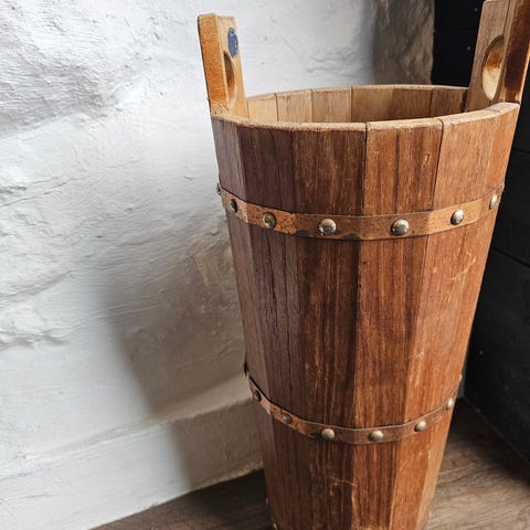Tennbrikettbokseholder - hele boksen med tennbriketter puttes oppi tredunken, da er den plutselig en dekorativ og sjarmerende pyntgjenstand. Koselig ved ovnen eller peishylla.