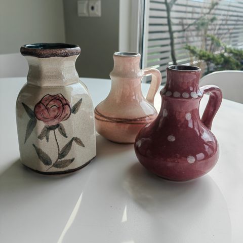 Tyske og norske fat og vaser, kanner, mugger, ølstøvler, ølkrus, veggvaser, Kari Trestakk, Scheurich, Strehla, Solvik, Spektro m.m. Kan kjøpes enkeltvis. Pris under hvert bilde. Er jevnlig i Oslo og av og til på Årnes og Jessheim. Sender med Posten og Post Nord.