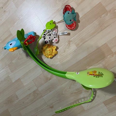 Fisher Price elektrisk uro kr 150. Lekene kan gå rundt, og det kan skrus på musikk om ønskelig. Monteres på eks senga.