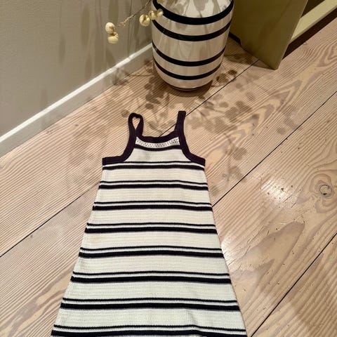 Kjole sydd i 1oo% bomull og med heklet overdel.