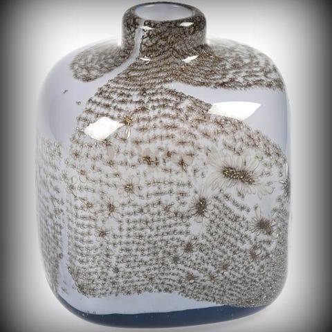 7.Kunstglass vase Benny Motzfeldt,PLUS Munnblåst. Klart krystall med innlagt jernspon. Syremerket BM PLUS 12,5 cm h. 800kr